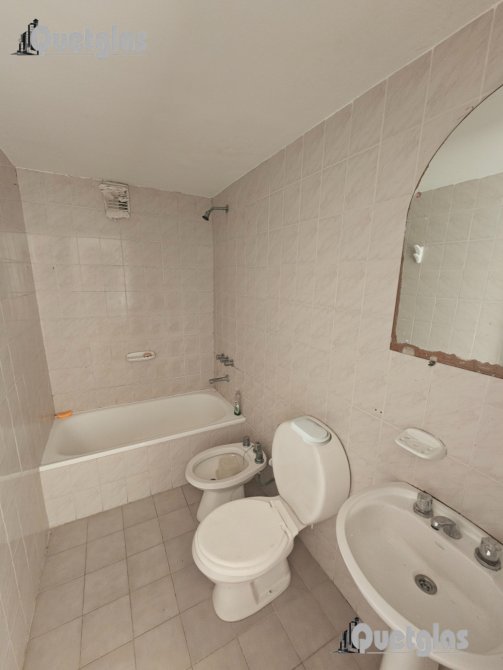 Baño completo con pisos y paredes cerámicas, inodoro, bidet, lavatorio y bañera, con agua fría y caliente